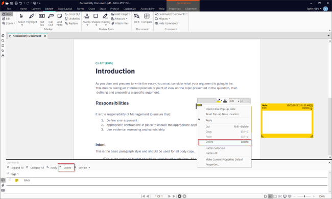 Nitro Pro lets you view all comments in your PDF file from a single location. The Comments pane lists all of the comments in your file, along with information relating to each comment.