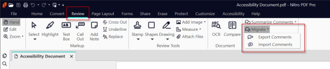 1. Go to the Review tab and in the Comments section, click on the arrow icon to the right of Migrate and select Import Comments.
