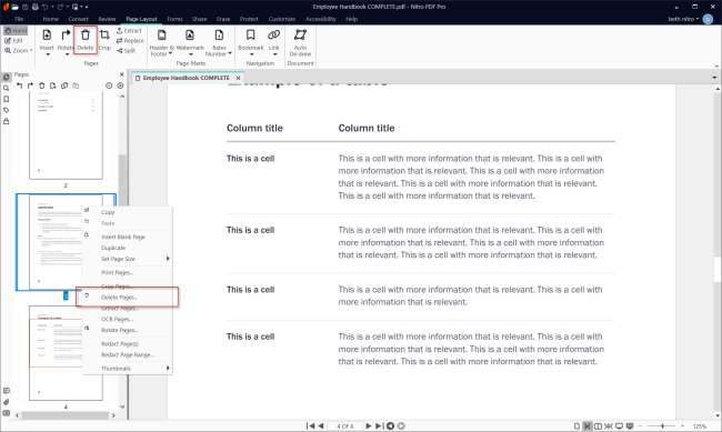 Nitro enables you to quickly delete one or more pages from within your PDF document. You can do this via the Pages pane or by using the Delete Pages tool.