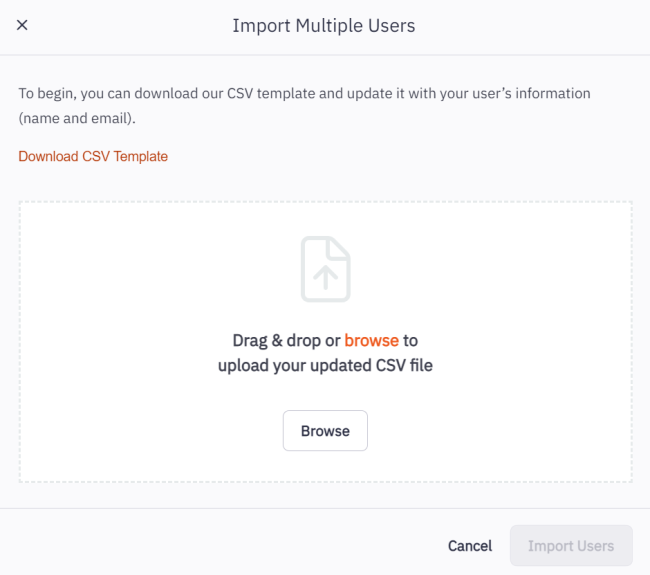 2.  In the resulting dialog box, click the Download CSV Template link.  Open the CSV and add the names and email addresses of all users you’d like to add to the account.  (Do not modify the headers in row 1 of the CSV file.)  When all users have been added to the CSV file, click Continue.