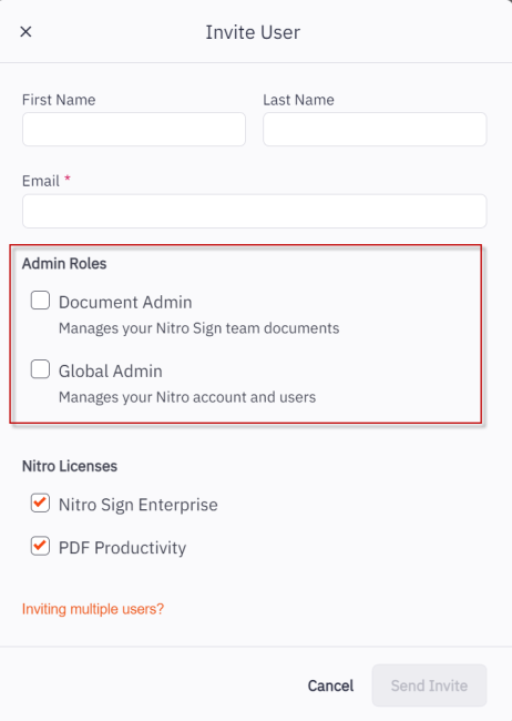• Document Admin:  Gives the user the ability to add or delete documents in your organization’s Team Documents library.  Team Documents are shared files that all members of your Nitro SIgn Team account can view/access.