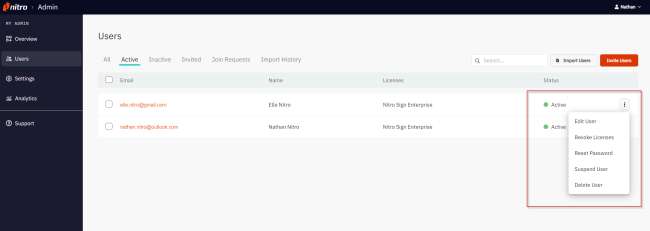 • Delete UserDeleting a user from your Nitro Sign Team will permanently delete the user’s account and all associated files store on Nitro Sign.  Before deleting a user, make sure to download or transfer any of the user’s files, as these cannot be recovered once the deletion process is complete.