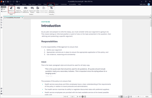 The Whiteout Tool in Nitro gives you the power to securely obscure content in PDF documents. However, use this powerful feature with care—just like using whiteout on paper, when a section of the document is covered with whiteout, the action cannot be undone after the document is saved.